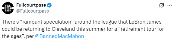 詹姆斯正在拓荒生存第23个赛季,他与湖东说念主的协议将在今夏到期,谈到詹姆斯的异日,ESPN名记Tim MacMahon暗意:“听着,我不知说念勒布朗我方盘算推看成念什么,我虽然也不知说念他要作念什么,但定约里大批的揣摸是,本年夏天将会有一次重聚,可能是一次载入汗青的告别巡演,詹姆斯下赛季将再次回到家乡,回到克利夫兰骑士。”