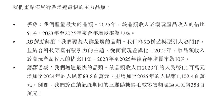 招股书中写谈:“咱们以IP价值最大化为中枢,构建了一个袒护产业价值链所联系键秩序的一体化平台。……证据弗若斯特沙利文,TOPTOY是业内少有的完了从IP孵化、运营到平直消耗者互动的潮玩产业链全袒护,并在全产业链中占据率先地位的品牌之一。”