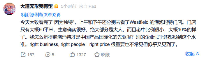毫无疑问,泡泡玛特的模式领有极高的上限。4月4日,投资东谈主段永平共享了我方考察外洋泡泡玛特门店的见闻:60平米的店生意火爆,且九成以上瑕瑜华东谈主的成年东谈主。他以为泡泡玛特是“中国产物国际化的前驱”,并给出了“rightbusiness,rightpeople”的评价。