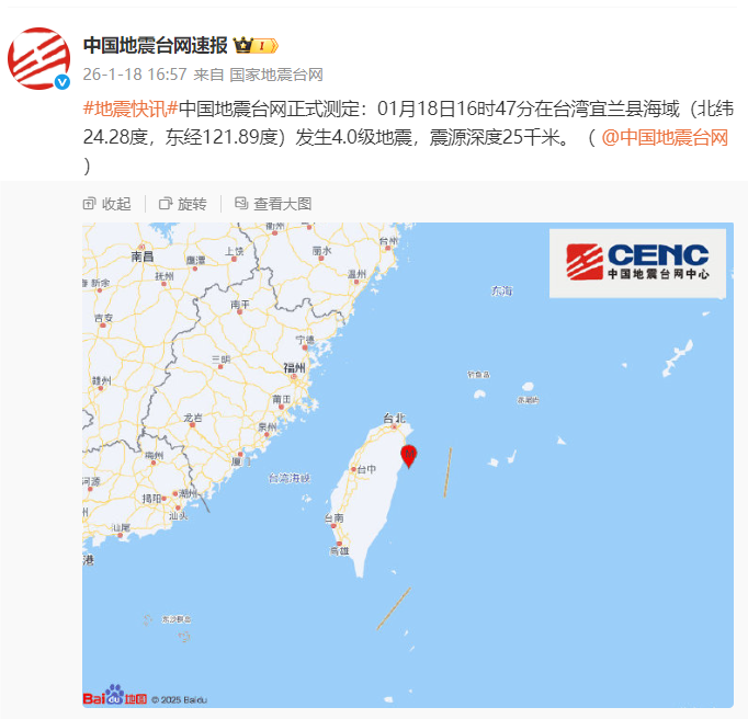 中国地震台网正式测定:01月18日16时47分在台湾宜兰县海域(北纬24.28度,东经121.89度)发生4.0级地震,震源深度25千米。