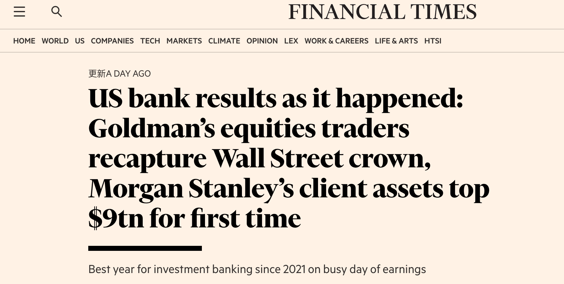 报道显示,高盛第四季度利润增长了12%,这得益于其与苹果信用卡合作关系的终止、投资银行业务的跃升以及股票交易部门的强劲表现。华尔街竞争对手摩根士丹利报告称,其第四季度利润增长了18%,这得益于其投资银行和股票交易业务的收益增长。