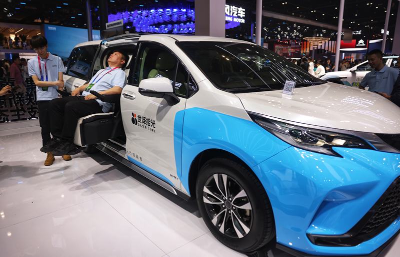 京津冀智能网联新能源汽车生态岗展区,责任主说念主员展示一款车载自动轮椅升降系统。新京报记者 李木易 摄