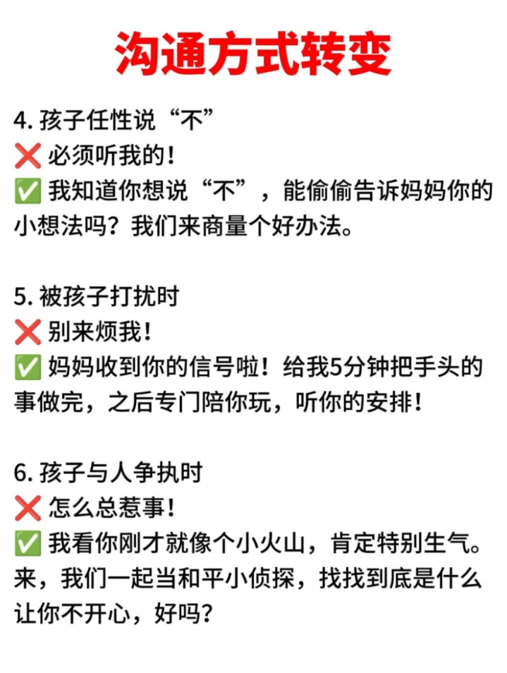 还有阻碍、蒙胧的话语,比如“再哭就不要你了”“别烦我,一边去”,对孩子来说更是庞杂的伤害。孩子对父母有着天生的依赖和信任,阻碍会让孩子堕入颤抖,失去安全感,蒙胧则会让孩子以为我方不被敬爱,内心变得伶仃。经久处在这样的语言环境里,孩子要么变得胆小恇怯,要么用反水来荫庇内心的不安,亲子之间的距离也会越来越远。