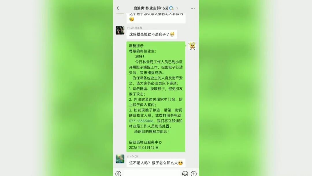小区物业工作人员告诉记者,这只猴子喜欢在沿街的两栋住宅楼出没,物业管家在业主群连续发布公告,提醒大家关好门窗,切勿挑逗和投喂猴子,同时也将情况报告给了相关单位。记者从邕宁区自然资源局野生动物保护股了解到,1月8日左右,他们就接到市民反映有猴子出现在龙岗片区周边几个小区,目前猴子的行踪飘忽不定,诱捕的难度非常高,也无法确定是否与去年出现在江南区的是同一只猴子。