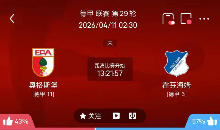 【011德甲】:奥格斯堡VS霍芬海姆 技能:2026-04-11 2:30