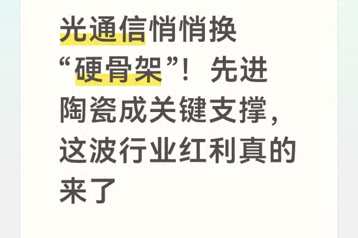 光通讯的新风口,内容上是生计和产业需求升级的势必圮绝,而先进陶瓷当作光通讯拓荒的“硬骨架”,凭借精确对接、高效散热、坚固看守的中枢上风,成为了这波产业升级的最大受益者之一。