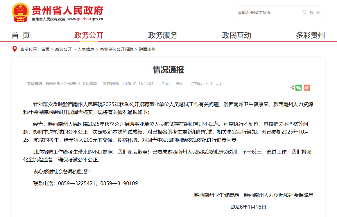 经查,黔西南州人民医院2025年秋季公开招聘事业单位人员笔试存在组织管理不规范、程序执行不到位、审核把关不严格等问题,影响本次笔试的公平公正,决定取消本次笔试成绩,对已报名的考生重新组织笔试,相关事宜另行通知。对已参加2025年10月25日笔试的考生,给予每人200元的交通、食宿补助。对调查中发现的问题依规依纪进行追责问责。