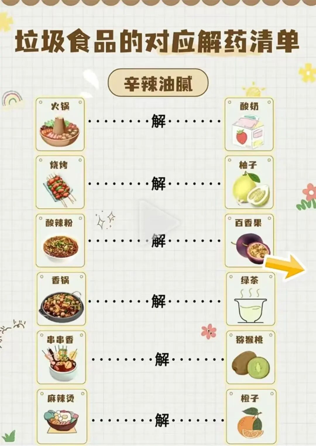 吃完火锅,喝杯酸奶“解一解”;吃了麻辣香锅,补点水果和绿茶……在一些短视频中,这样的饮食搭配被形容成“垃圾食品解药”,像是在不改变饮食习惯的情况下,给身体健康找到了一条“捷径”。