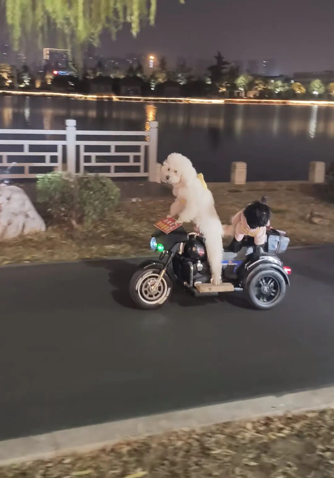 记者了解到,骑车的白色大狗名叫蛋蛋,是一只比熊。“它天生聪明又活泼,站立行走,爬楼梯,立定跳这些技能,当年都是一教就会,从不用费太多劲。”