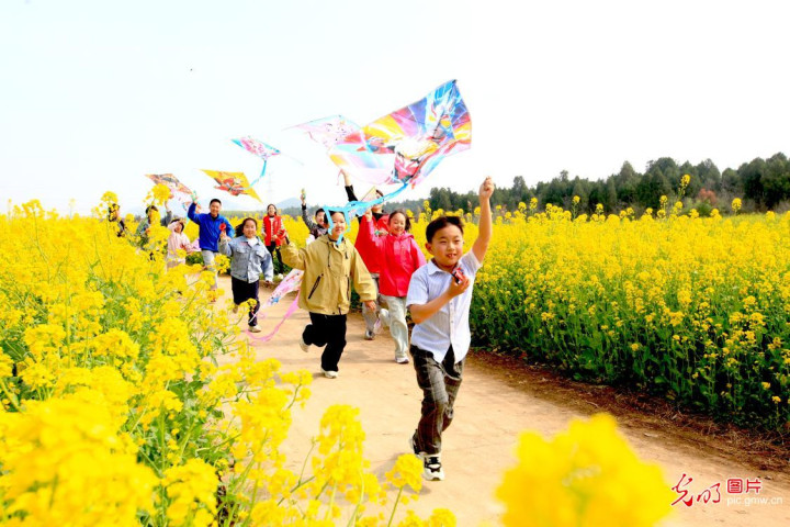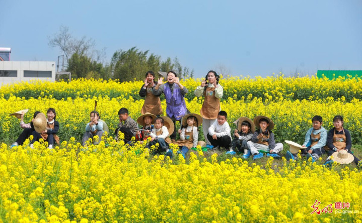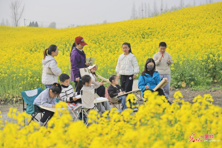 2026年4月1日,首个春假的第一天,江苏省东台市执行小学的学子们在西溪花田间支起画板,以当然为课堂,用画笔定格春日盛景,在花田中游玩,畅享春日好时光。(练益华摄/光明图片)