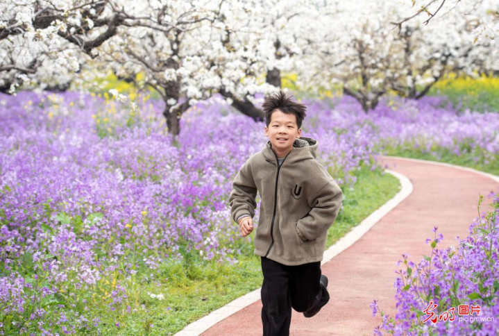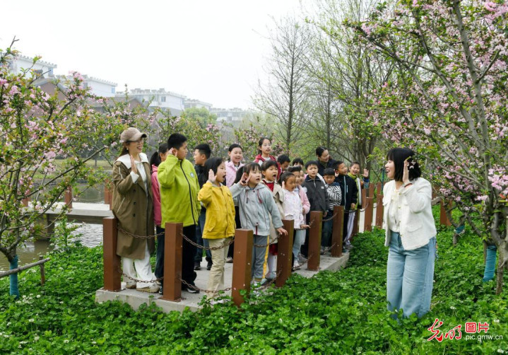2026年4月1日,江苏淮安市小学生在古黄河生态习惯园赏花游玩,尽享春日好意思好。(贺敬华摄/光明图片)