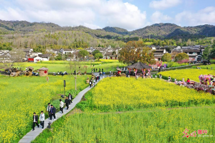 2026年4月1日,安徽省1—8年纪学生迎来首个春假,黄山市黟县西递景区迎来研学旅游岑岭,学生们感受乡村好意思景,体验习惯风情,乐享春假。(许家栋摄/光明图片)