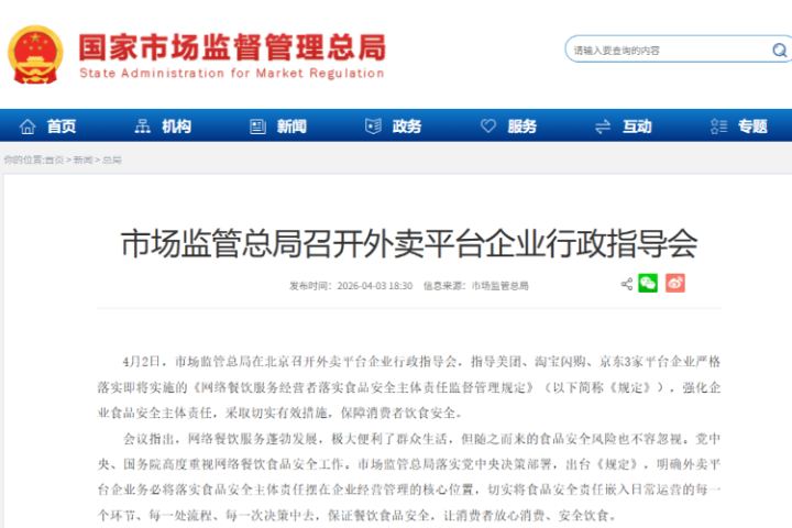 4月2日,南齐记者获悉,国度阛阓监管总局在北京召开外卖平台企业行政带领会,带领好意思团、淘宝闪购、京东3家平台企业严格落实行将实施的《网罗餐饮职业谋略者落实食物安全主体遭殃监督惩处章程》(以下简称《章程》),强化企业食物安全主体遭殃,采选切实灵验措施,保险糜费者饮食安全。