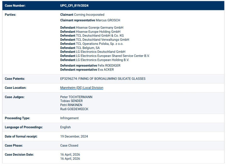 2026年4月16日,欧洲融合专利法院(UPC)曼海姆处所分院就好意思国康宁公司诉TCL及关连企业滋扰其玻璃基板专利EP3296274案作出一审判决。