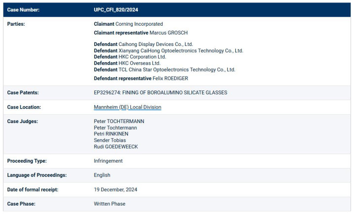 本案领先由康宁于2024年12月19日向UPC曼海姆处所分院拿起,被告包括TCL、海信与LG等多家电视制造商。关联词LG和海信在才能中先后与康宁罢了了息争,放弃了诉讼。只须TCL一家坚捏到了终末。