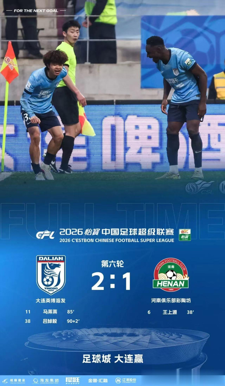 在中超第6轮比赛中,大连英博队镇守主场迎战河南队。最终,在3连胜士气飞扬+主场上风加捏下,大连英博以2:1的比分蹙悚驯服河南队,获取了本赛季中超4连胜。