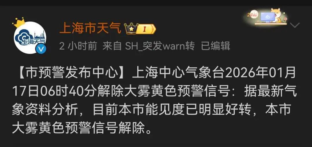 上海中心气象台今天(1月17日)6时40分解除大雾黄色预警信号:据最新气象资料分析,目前本市能见度已明显好转,本市大雾黄色预警信号解除。